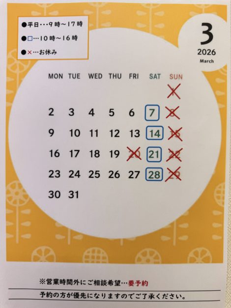 News新着情報 HOME> 新着情報> 新着情報 詳細 2、3月の営業案内 2、3月の営業カレンダーです。 臨時休業、急な訪問相談や研修などもありますので、保険相談は事前予約をおすすめしております。 お気軽にお問合せください。 お知らせ一覧に戻る>>